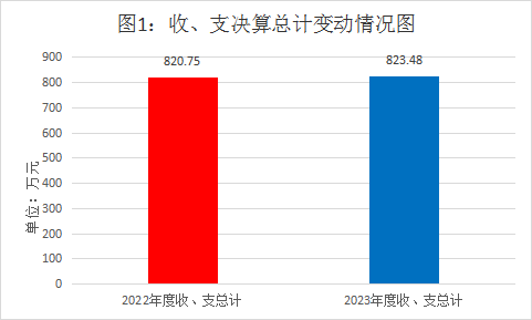 2023年度收、支总计均为823.48万元。与2022年度相比,收、支总计各增加2.73万元,增长1.00%。主要变动原因是教职工工资收入增加。