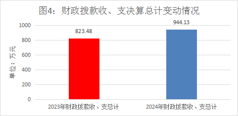 2024年度财政拨款收、支总计均为944.13万元。与2023年度相比,财政拨款收、支总计各增加120.65万元,增长14.65%。主要变动原因是安乐小学撤校,人员合并到复兴镇小收入增加。