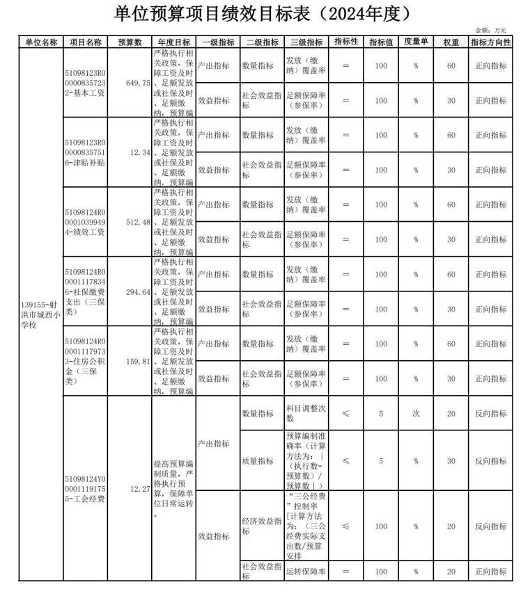 (四)项目绩效目标设置。严格执行相关政策,保障工资、社保等及时足额发放缴纳,提高预算编制质量,减少结余资金,保障单位日常运转。不同项目有具体指标,如工资和社保类项目产出指标为发放(缴纳)覆盖率 100%,效益指标为足额保障率(参保率)100%;公用经费类项目产出指标有科目调整次数≤5 次、预算编制准确率≤5%,效益指标有“三公”经费控制率≤100%、运转保障率 100%。