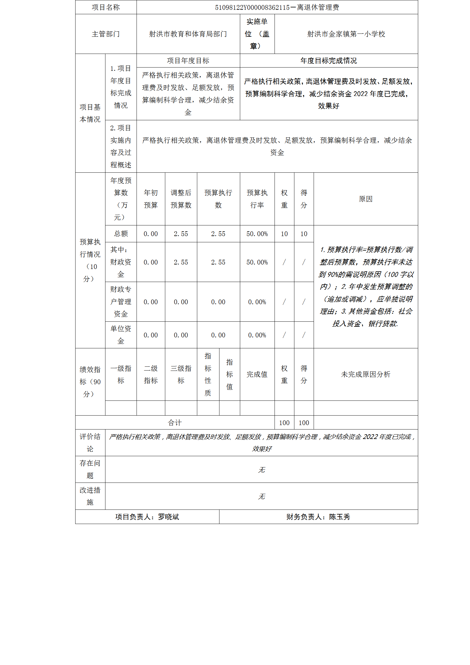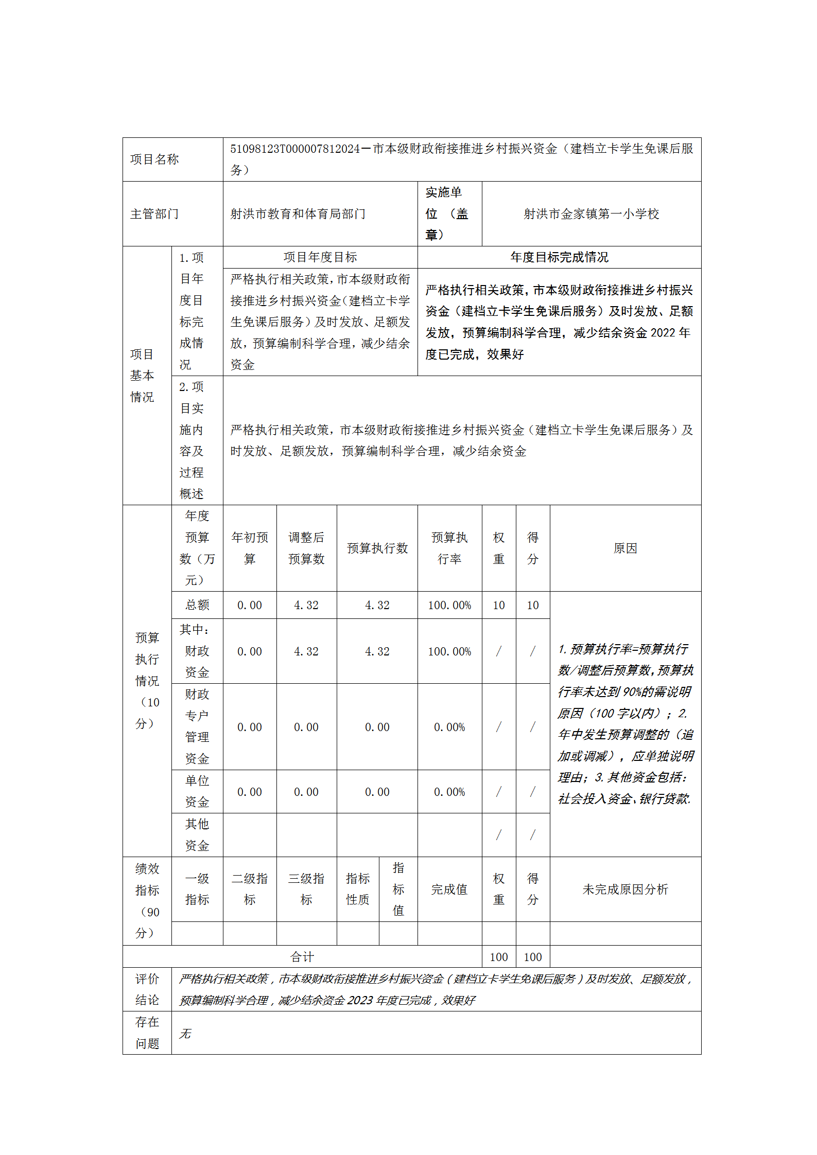 2023年射洪市金家镇第一小学校退管费、乡村振兴专项资金预算项目绩效自评报告