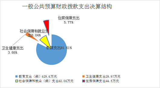 2023年一般公共预算财政拨款支出1140.49万元,主要用于以下方面:教育支出842.88万元,占73.92%;社会保障和就业支出167.07万元,占14.64%;卫生健康支出49.54万元,占4.34%;住房保障支出76.12万元,占6.67%;农林水支出4.88万元,占0.43%。