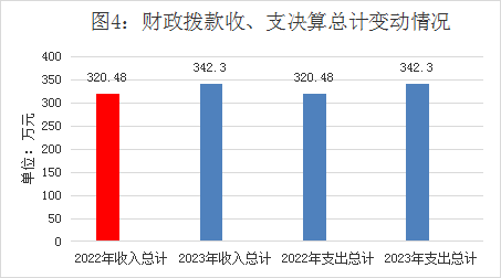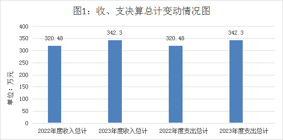 2023年度收、支总计均为342.3万元。与2022年度相比,收、支总计各增加21.82万元,增长6.8%。主要变动原因是人员经费支出增加。