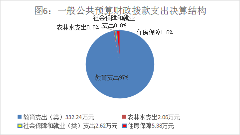 2023年度一般公共预算财政拨款支出342.3万元,主要用于以下方面:教育支出332.24万元,占97%;社会保障和就业支出2.62万元,占0.8%;农林水支出2.06万元,占0.6%;住房保障支出5.38万元,占1.6%。