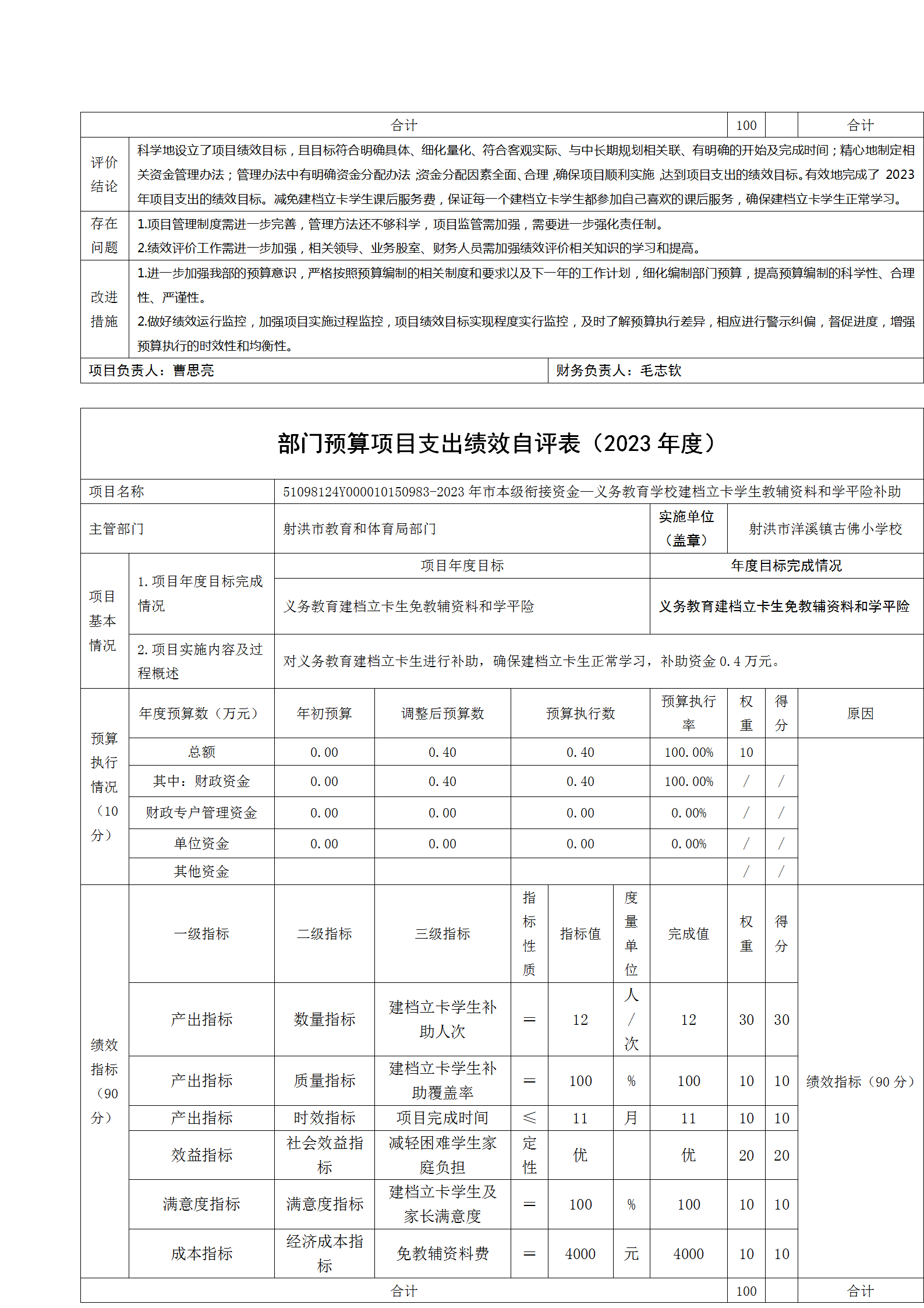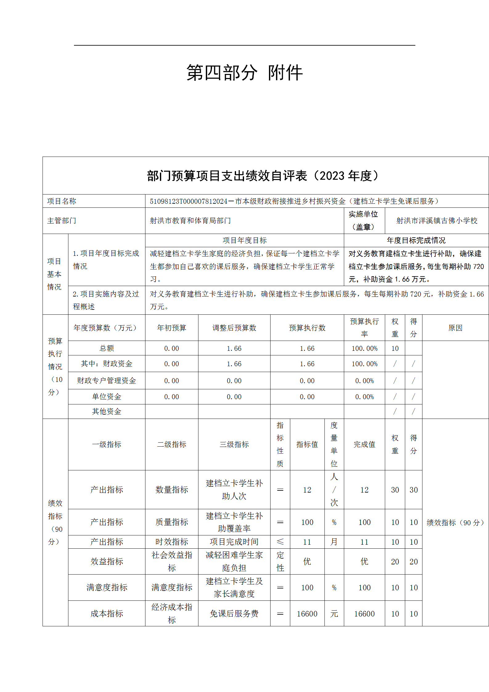 根据预算绩效管理要求,本单位在2023年度预算编制阶段,组织对射洪市洋溪镇古佛小学校项目等1个项目开展了预算事前绩效评估,对1个项目编制了绩效目标,预算执行过程中,选取1个项目开展绩效监控,组织对1个项目开展绩效自评,《2023年射洪市洋溪镇古佛小学校部门整体绩效评价报告》绩效自评表详见第四部分附件。