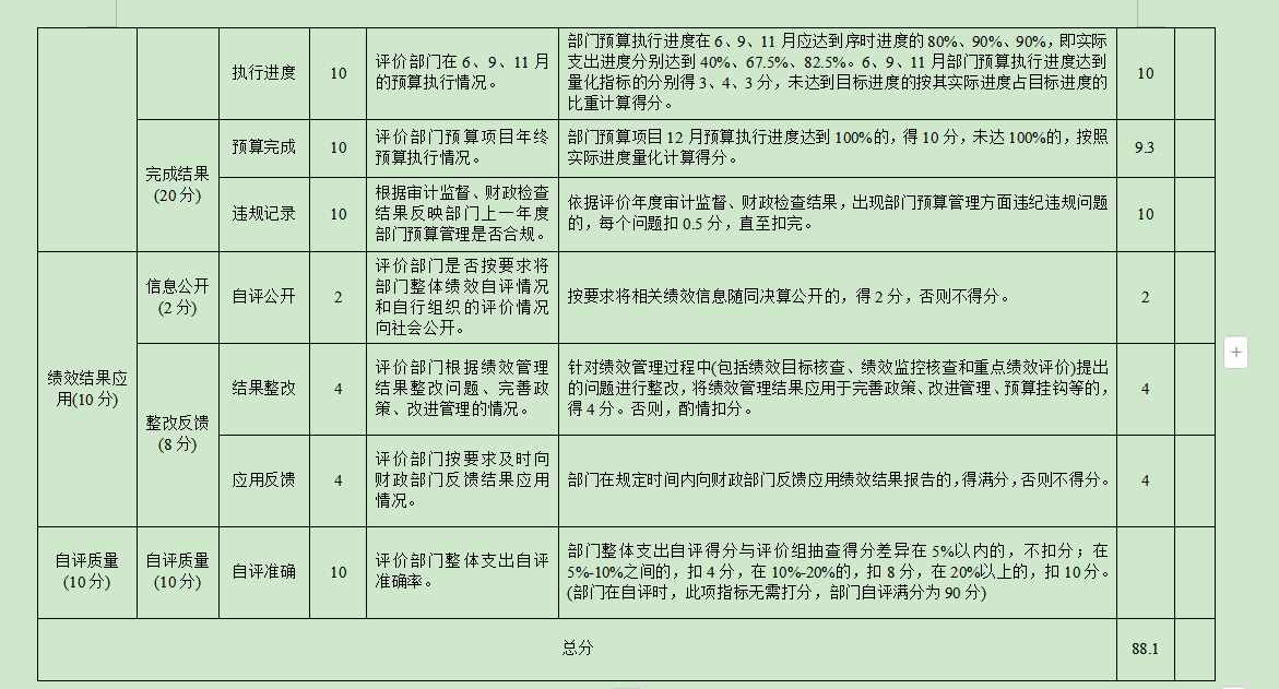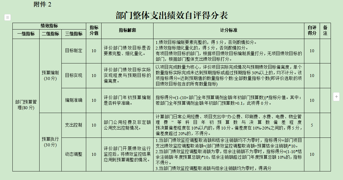 注:1.其他资金包括与中央、省级财政补助资金、市(县)级财政资金共同投入到同一项目的自有资金、社会资金,以及以前年度的结转结余资金等。2.定量指标,主管部门对资金使用单位填写的实际完成值汇总时,绝对值直接累加计算,相对值按照资金额度加权平均计算。 3.定性指标。资金使用单位分别按照100%-80%(含)、80%-60%(含)、60-0%合理填写实际完成值,在汇总时,按照资金额度加权平均计算。 4.全年执行数是指按照国库集中支付制度要求,支付到商品和劳务供应者或者用款单位形成的实际支出。