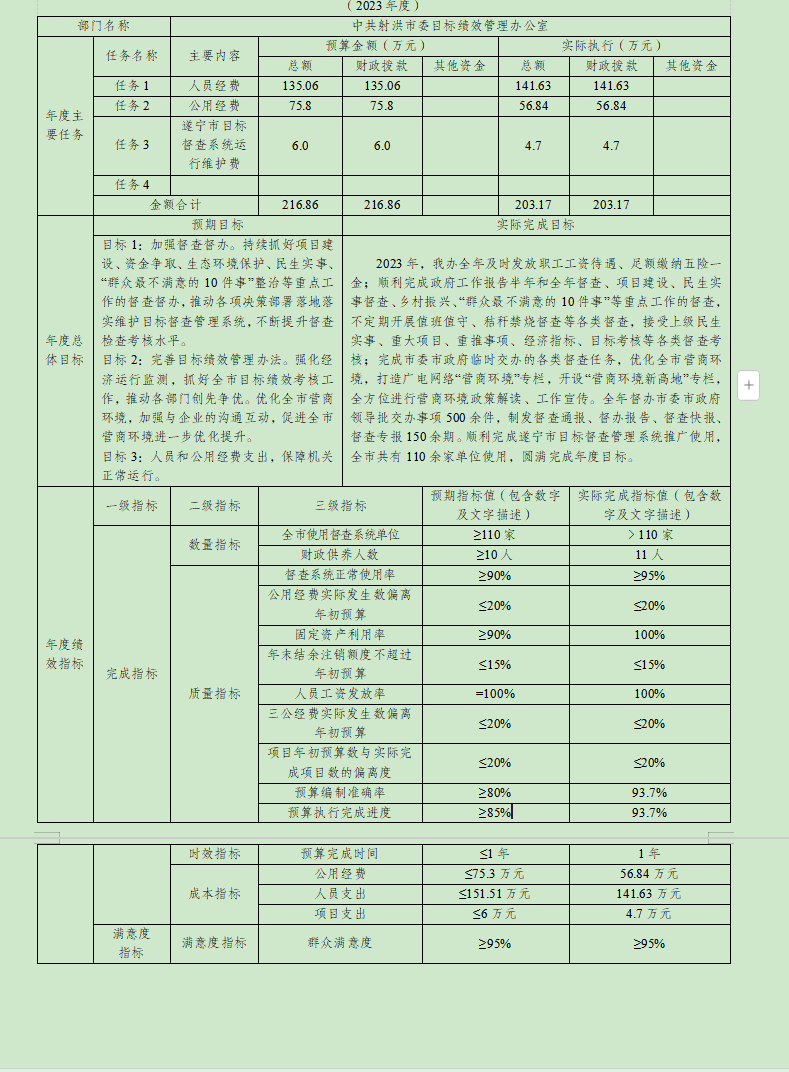 根据《关于开展2024年财政支出绩效自评工作的通知》(射财发〔2024〕29号)要求,我办立即开展了2023年部门整体支出绩效自评工作,现将自评情况报告如下: