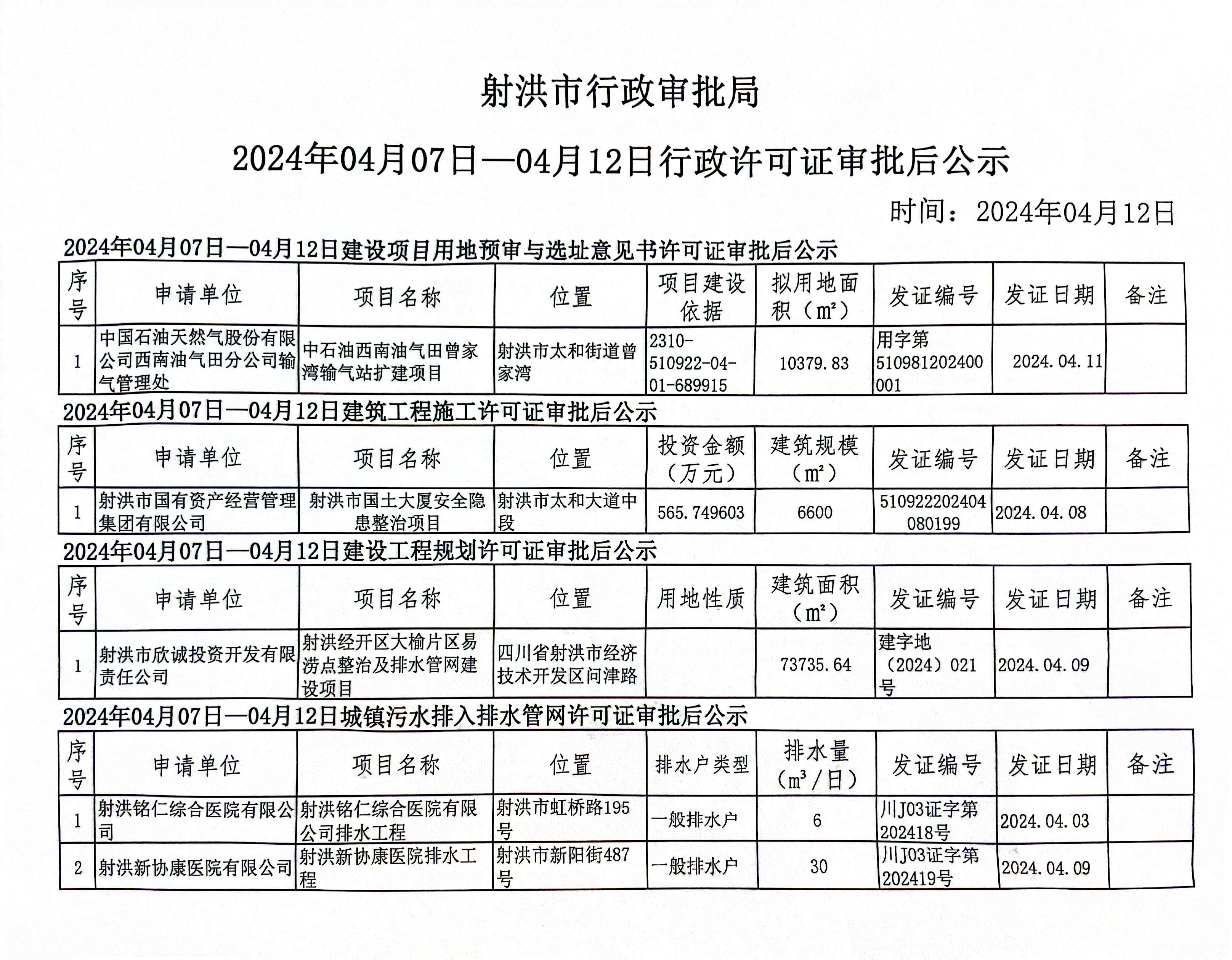 射洪市行政审批局2024年04月07日-04月12日行政许可审批后公示