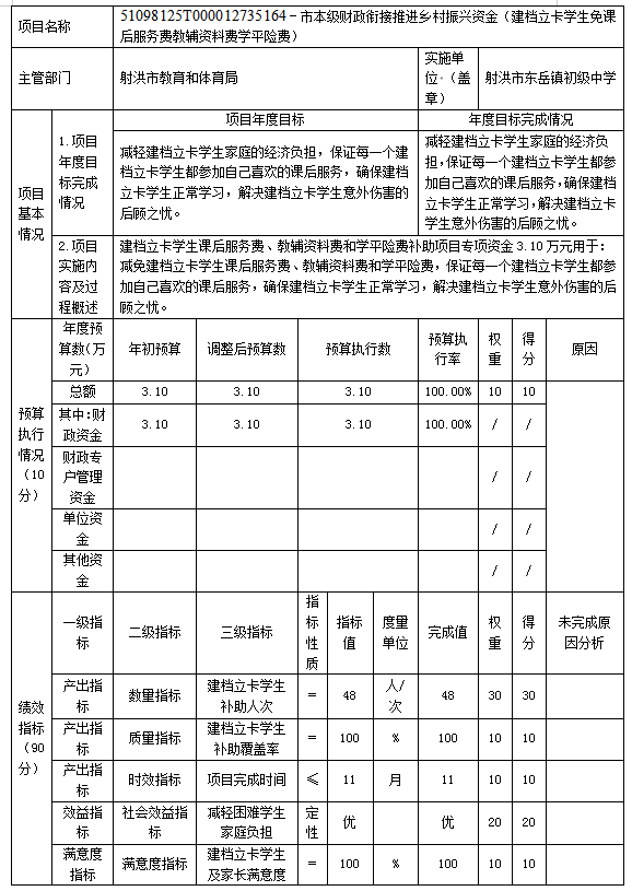 组织对2024年度一般公共预算全面开展绩效自评,形成射洪市东岳镇初级中学校单位预算绩效评价报告和专项预算项目绩效评价报告,其中,射洪市东岳镇初级中学校单位预算绩效自评得分为95分,绩效自评综述:有效地完成了 2024年预算项目的绩效目标,全年预算总额589.17万元,实际支出 589.17 万元,预算执行率 100%。通过建立 “校级统筹、财务归口、分级负责” 的管理机制,保障了教学运转、师资建设、设施维护等核心工作的资金需求,让每一笔资金都发挥最大效益。规范使用人员经费,保障教职工的工资福利及相关待遇,合理使用公用经费,保障义务教育教学活动正常开展,保障学校正常运。合理安排资金改善办学条件,办人民满意的教育。专项预算项目绩效自评得分为96分,绩效自评综述:2024年家庭经济困难学生免课后服务费教辅资料费学平险费专项支出在资金使用、项目实施和绩效目标完成等方面取得了良好的成效。全年预算总额3.10万元,实际支出 3.10万元,预算执行率 100%。项目资金到位及时,使用合理规范;项目实施组织有序,执行情况良好;项目绩效目标完成度高,有效减轻了家庭经济困难学生家庭经济负担,促进了教育公平,得到了相关利益方的高度认可。