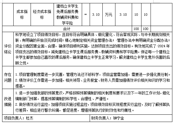 家庭经济困难学生免课后服务费、教辅资料费和学平险费专项预算项目在资金使用、项目实施和绩效目标完成等方面取得了良好的成效。项目资金到位及时,使用合理规范;项目实施组织有序,执行情况良好;项目绩效目标完成度高,有效减轻了家庭经济困难学生家庭经济负担,促进了教育公平,得到了相关利益方的高度认可。综合评价,该项目绩效评价结果为优秀。在今后的工作中,应持续关注项目实施过程中存在的问题,不断改进和完善项目管理,确保项目效益得到更好的发挥。