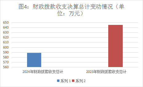 2024年度财政拨款收入、支出总计均为589.17万元。与2023年度相比,财政拨款收入、支出总计各减少55.94万元,下降8.67%。主要变动原因是本年度有人员退休,人员经费支出减少。