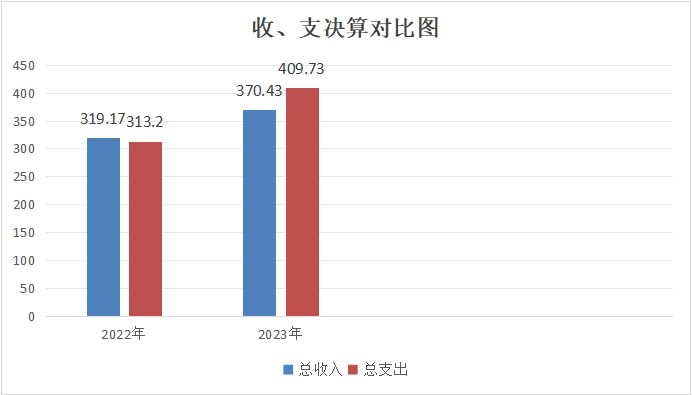 2023年度收、支总计均为409.73万元。与2022年度相比,收、支总计各增加90.56万元,增长22.1%。主要变动原因是2023年医疗业务发展需要,招聘医生护士等相关专业人员3人,采购办公设备等,人员经费及商品服务支出增加,故总支出较2022年增加。
