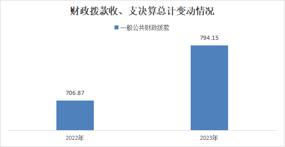 2023年度财政拨款收、支总计均为794.15万元。与2022年度相比,财政拨款收、支总计各增加87.28万元,增长12.3%。主要变动原因是村基药补助增加且退休人员增加,退休补助拨付相应增加。
