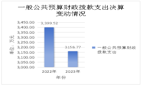 2023年度一般公共预算财政拨款支出3158.77万元,占本年支出合计的100%。与2022年度相比,一般公共预算财政拨款支出减少240.75万元,下降7.08%。主要变动原因是乡村项目资金未执行。