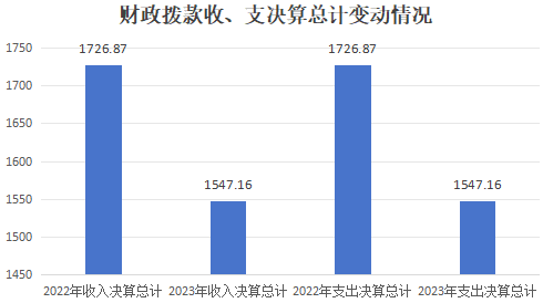 2023年度财政拨款收、支总计均为1547.16万元。与2022年度相比,财政拨款收、支总计各减少179.71万元,下降10.4%。主要变动原因是项目支出减少。