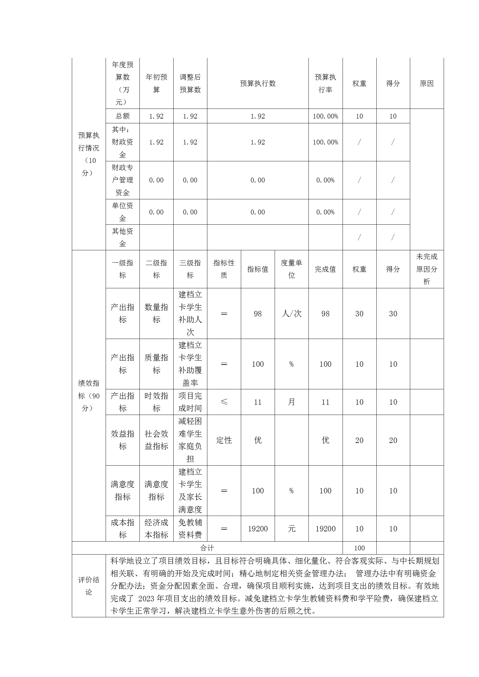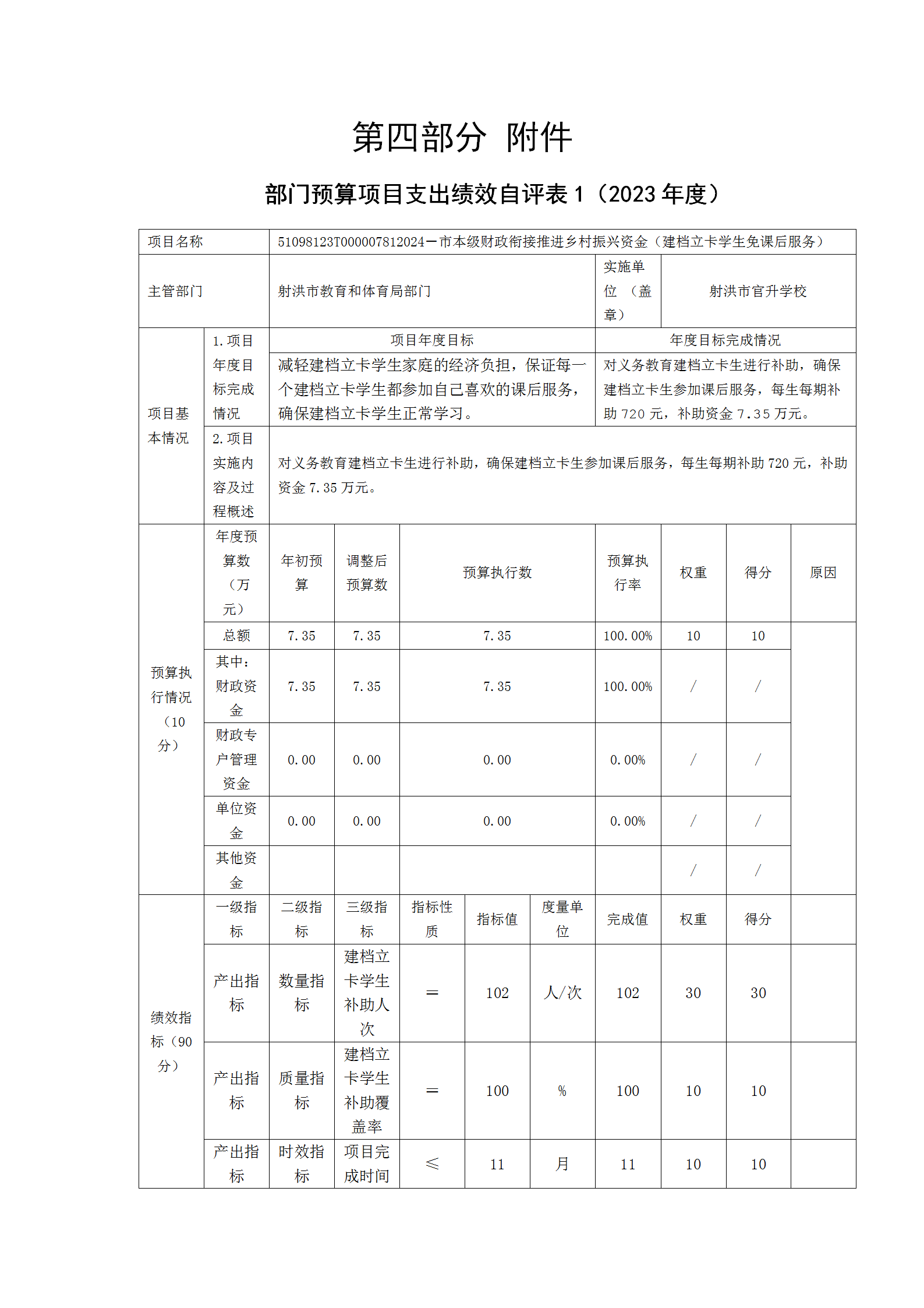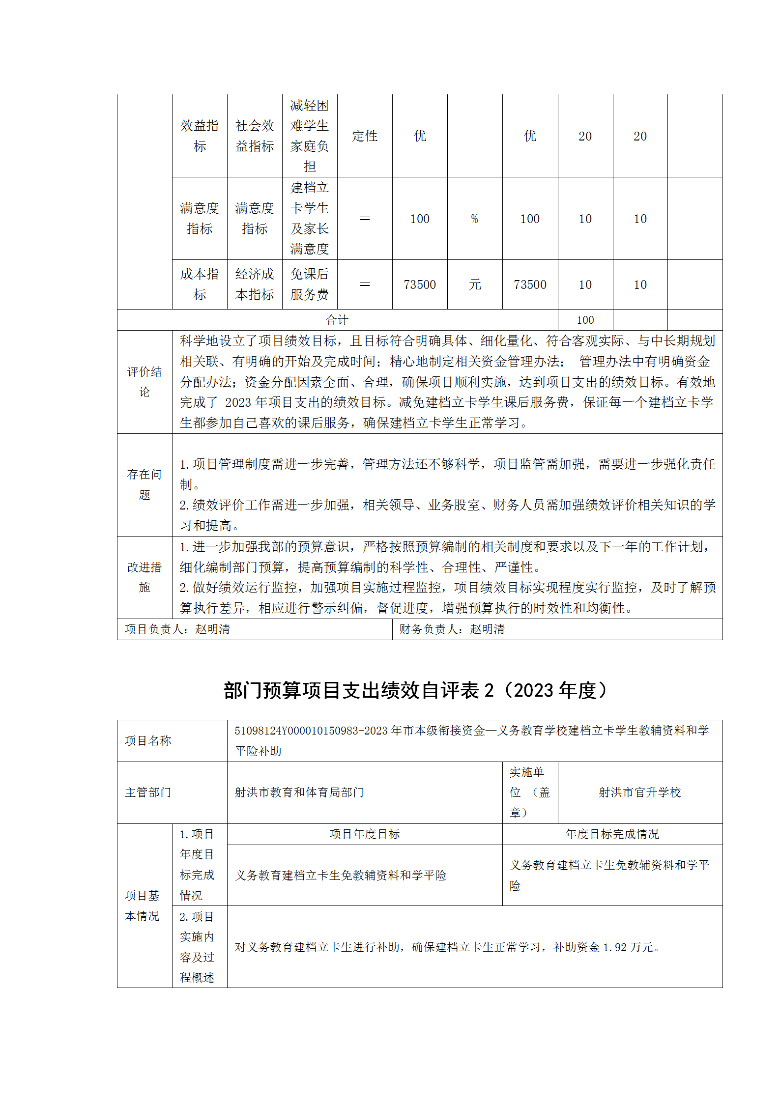 根据预算绩效管理要求,本单位在2023年度预算编制阶段,组织对基本工资、津贴补贴、绩效工资、住房公积金、社保缴费、市本级财政衔接推进乡村振兴资金(建档立卡学生免课后服务)、市本级衔接资金—义务教育学校建档立卡学生教辅资料和学平险补助等11个项目开展了预算事前绩效评估,对11个项目编制了绩效目标,预算执行过程中,选取2个项目开展绩效监控,组织对2个项目开展绩效自评,绩效自评表详见第四部分附件。