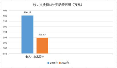2022年度收、支总计391.87万元。与2021年相比,收、支总计各减少8.3万元,下降2.1%。主要变动原因是收、支总计减少21.96万元,下降1.63%。主要变动原因一是新冠肺炎疫情常态化防控工作要求严格,导致大量病员流失,医疗收入减少;二是医保局对医保基金、对医疗单位的监管更加严格;三是2020年结转财政补助收入21.53万元至2021年使用,2022年收支总计较2021年减少。