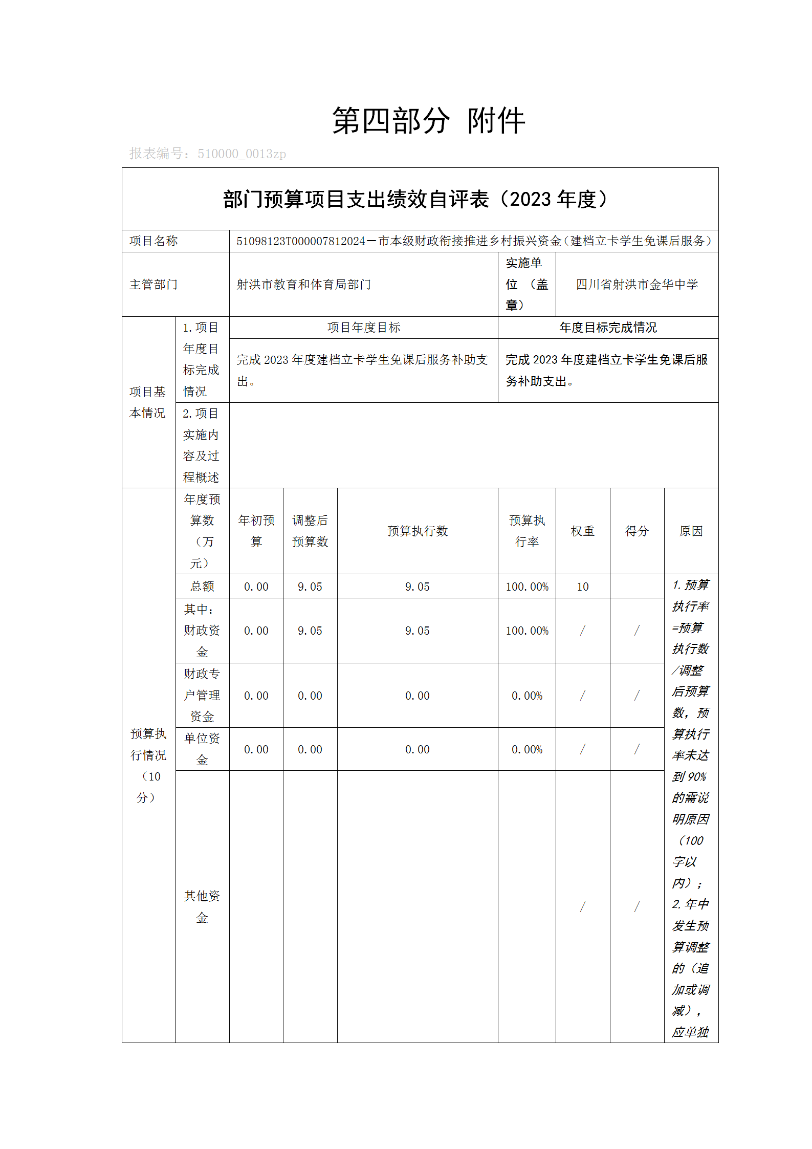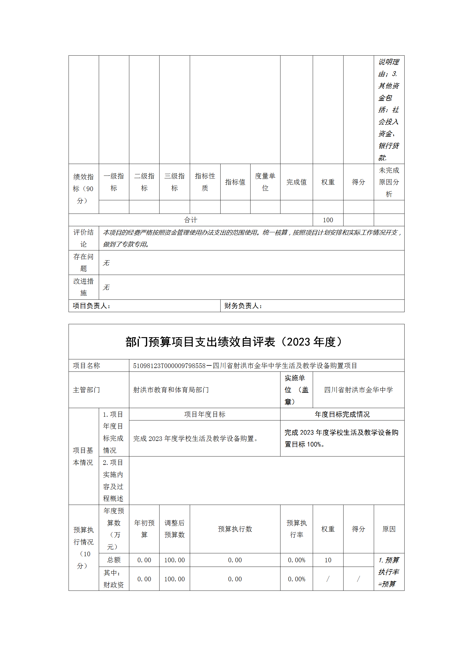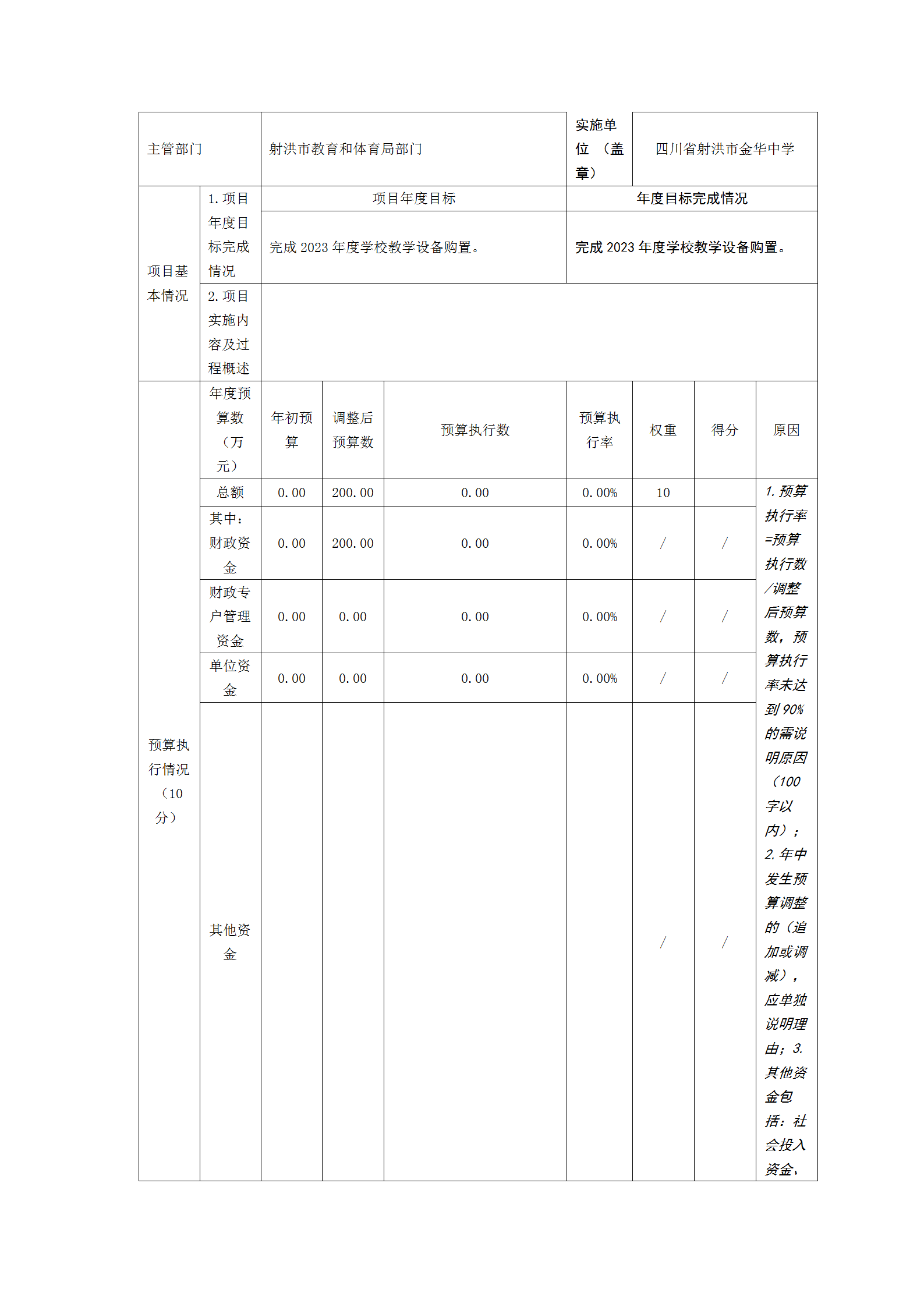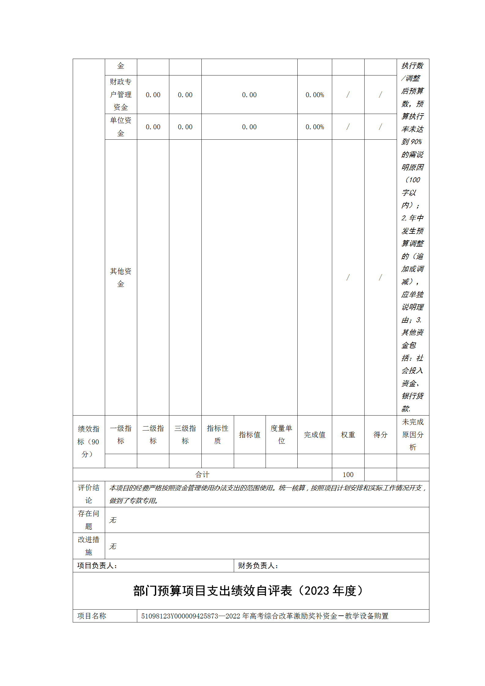 根据预算绩效管理要求,本部门在2023年度预算编制阶段,组织对2023年度一般公共预算、政府性基金预算、国有资本经营预算、社会保险基金预算以及资本资产、债券资金等全面开展绩效自评,形成金华中学绩效自评报告,其中,金华中学绩效自评得分为92.5分,绩效自评综述:总体情况良好,绩效自评报告详见附件。