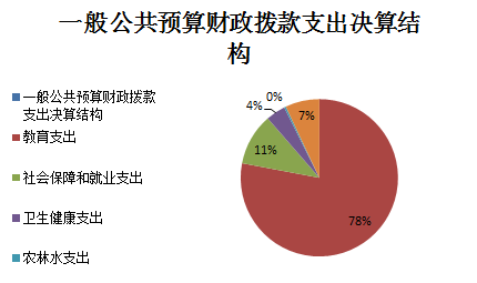 2023年一般公共预算财政拨款支出4755.29万元,主要用于以下方面:教育支出3707.62万元,占77.97%;社会保障和就业支出506.14万元,占10.64%;卫生健康支出191.7万元,占4.03%;住房保障支出333.51万元,占7.01%;农林水支出16.32万元,占0.34%。