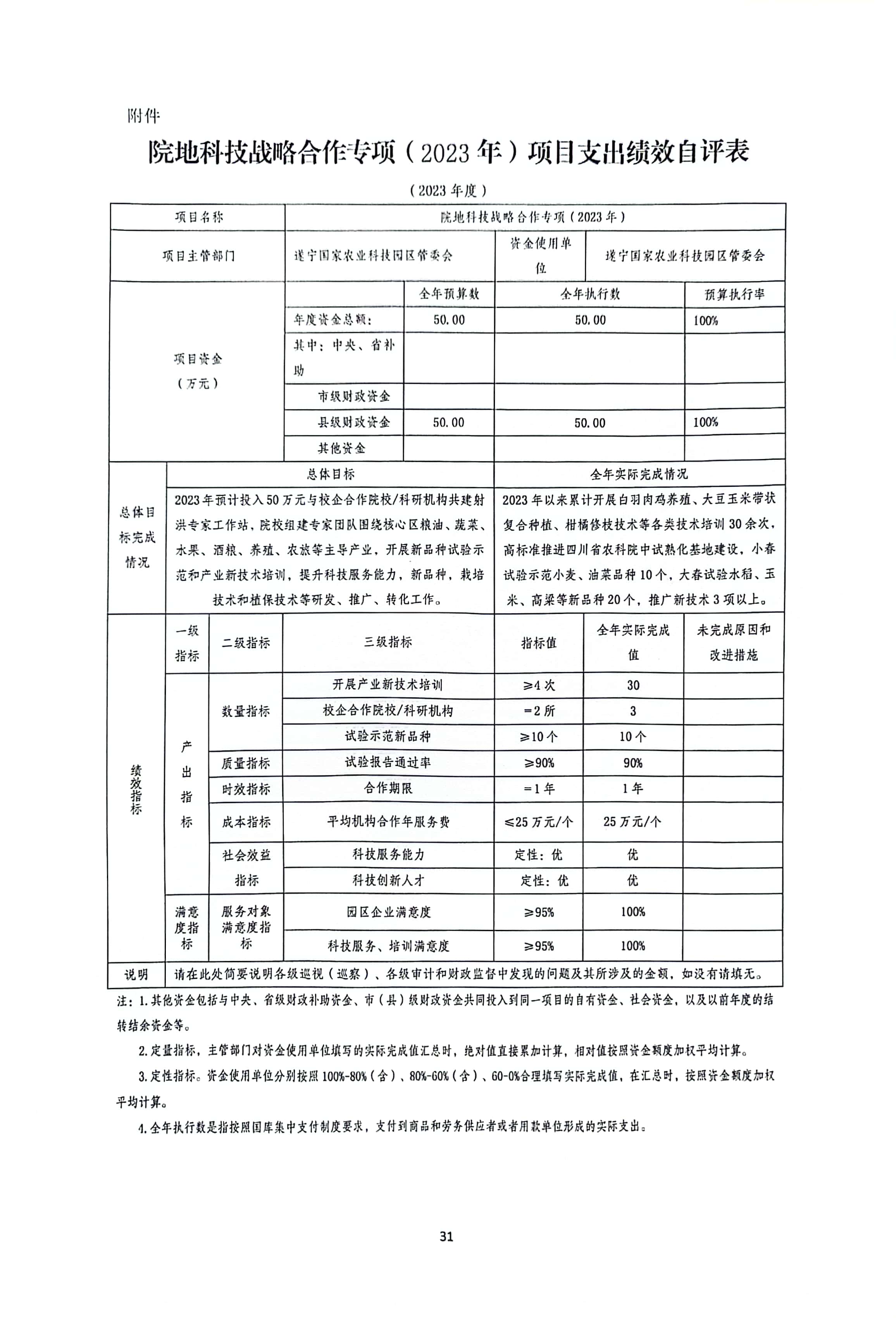 组织对2023年度一般公共预算、政府性基金预算、国有资本经营预算、社会保险基金预算以及资本资产、债券资金等全面开展绩效自评,形成1部门整体(含部门预算项目)绩效自评报告,其中,遂宁国家农业科技园区管委会部门整体(含部门预算项目)绩效自评得分为90分,绩效自评综述:综合2023年度本单位财政预算整体支出绩效评价情况认为,本单位在财政预算资金管理上措施得力。预算执行严格有序,预算管理规范可控,取得了较好社会效益,通过数据分析和指标评价,我们认为该部门整体支出绩效表现较好。