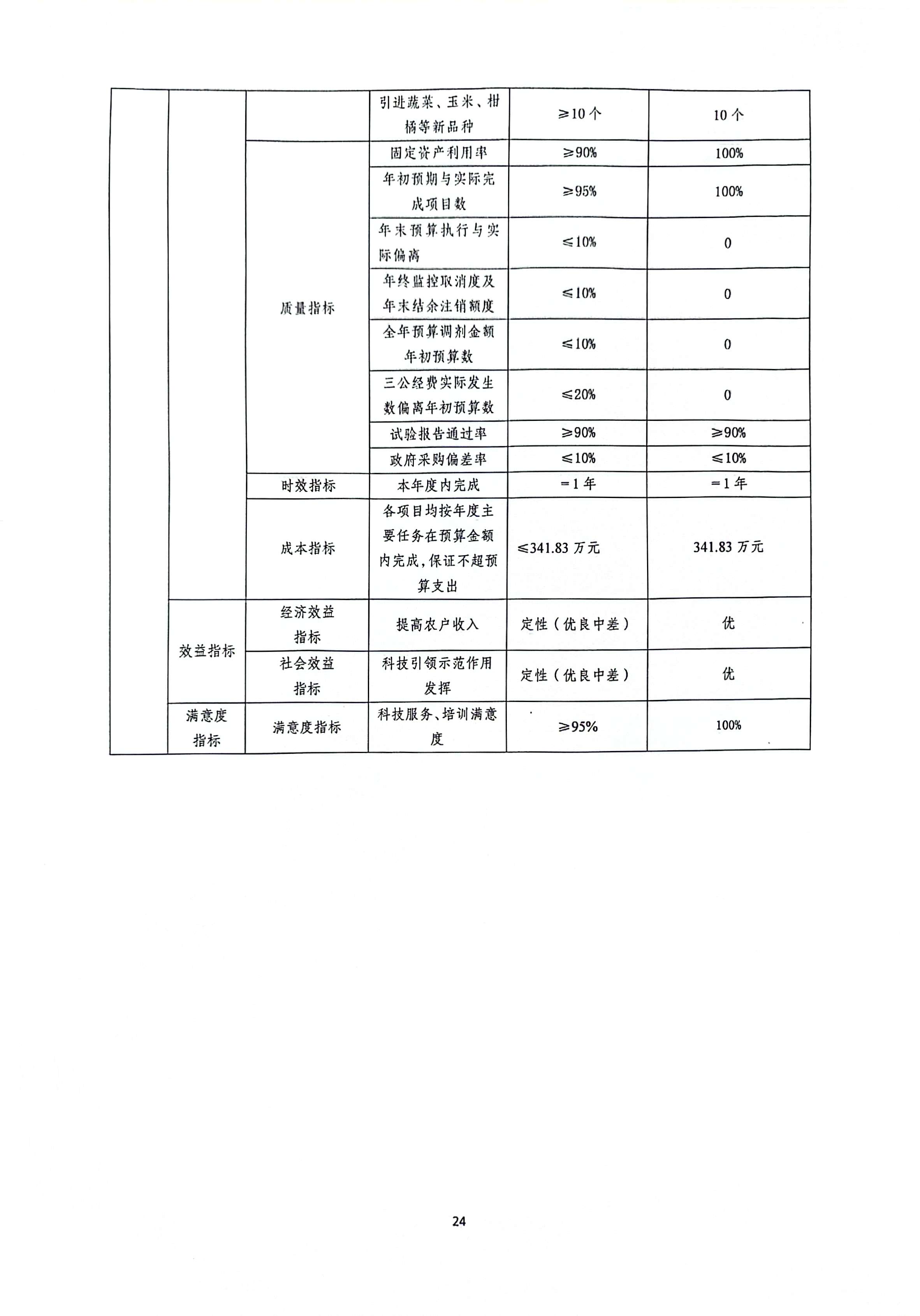 2.项目设置了两个数量指标,开展产业新技术培训次数和校企合作院校/科研机构家数以及试验示范新品种数量,设置了质量指标及一项经济成本指标,目前来看,应实现的具体绩效目标已经完成。