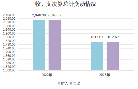 2023年度收、支总计均为1812.67万元。与2022年度相比,收、支总计各减少235.72万元,下降11.5%。主要变动原因是2023年度专项资金项目减少。