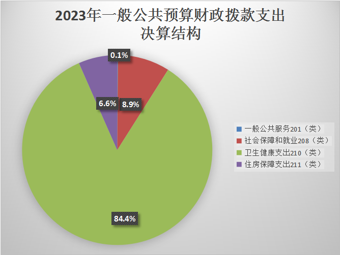 2023年一般公共预算财政拨款支出272.53万元,主要用于以下方面: 一般公共服务支出201(类)0.34万元,占0.1%;社会保障和就业208(类)支出24.13万元,占8.9%;卫生健康支出210(类)230.1万元,占84.4%;住房保障支出221(类)支出17.96万元,占6.6%。