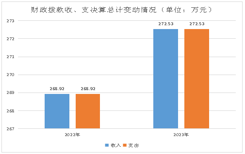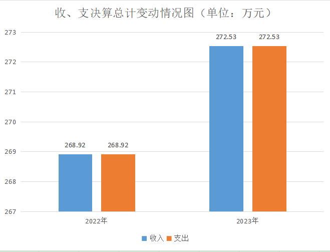 2023年度收入总计272.53万元、支出总计272.53万元。与2022年相比,收入总计增加3.61万元、增长1.3%,支出总计增加3.61万元、增长1.3%。主要变动原因是新招录人员增多,收入支出经费增加。