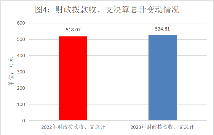 2023年度财政拨款收、支总计均为524.81万元。与2022年度相比,财政拨款收、支总计各增加6.77万元,增长1.31%。主要变动原因是:工资调整,人员经费支出增加。