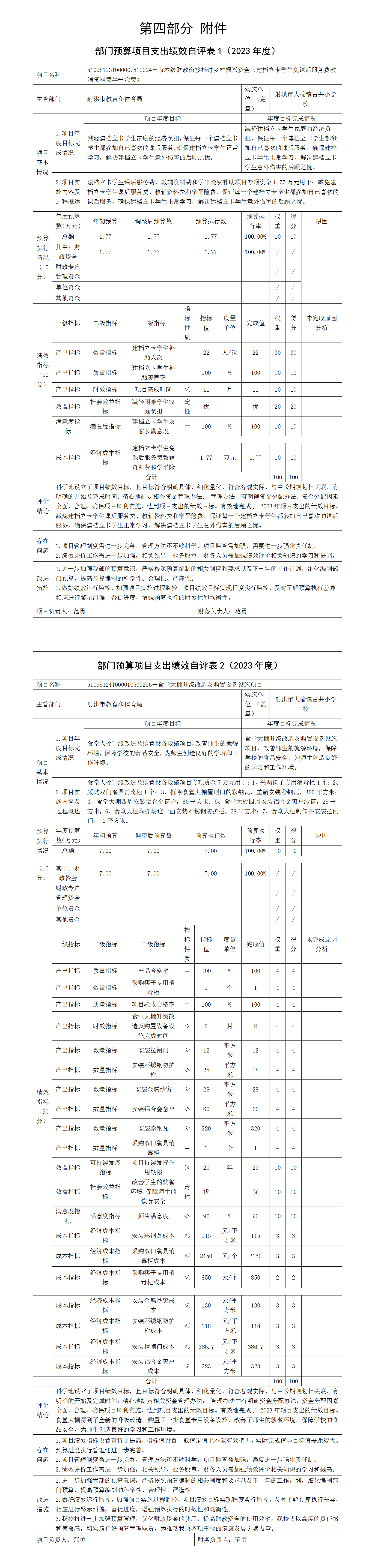 根据预算绩效管理要求,本单位在2023年度预算编制阶段,组织对建档立卡学生免课后服务费教辅资料费学平险费和食堂大棚升级改造及购置设备设施2个项目开展了预算事前绩效评估,对建档立卡学生免课后服务费教辅资料费学平险费和食堂大棚升级改造及购置设备设施2个项目编制了绩效目标,预算执行过程中,选取2个项目开展绩效监控,组织对2个项目开展绩效自评,绩效自评表详见第四部分附件。