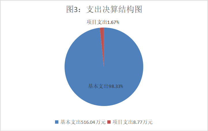 2023年度本年支出合计524.81万元,其中:基本支出516.04万元,占98.33%;项目支出8.77万元,占1.67%;上缴上级支出0万元,占0%;经营支出0万元,占0%;对附属单位补助支出0万元,占0%。