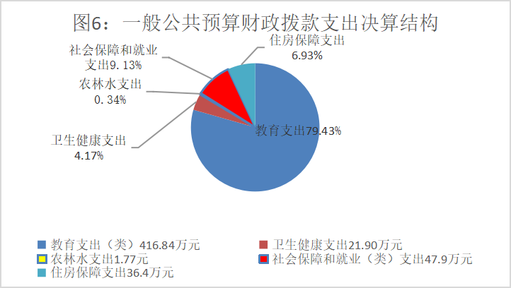 2023年度一般公共预算财政拨款支出524.81万元,主要用于以下方面:教育支出416.84万元,占79.43%;社会保障和就业支出47.90万元,占9.13%;卫生健康支出21.90万元,占4.17%;住房保障支出36.40万元,占6.93%;农林水支出1.77万元,占.034%。