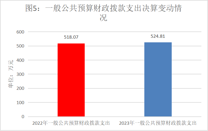 2023年度一般公共预算财政拨款支出524.81万元,占本年支出合计的100%。与2022年度相比,一般公共预算财政拨款支出增加6.77万元,增长1.31%。主要变动原因是:工资调整,人员经费支出增加。