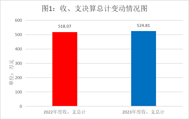 2023年度收、支总计均为524.81万元。与2022年度相比,收、支总计各增加6.77万元,增长1.31%。主要变动原因是:工资调整,人员经费支出增加。