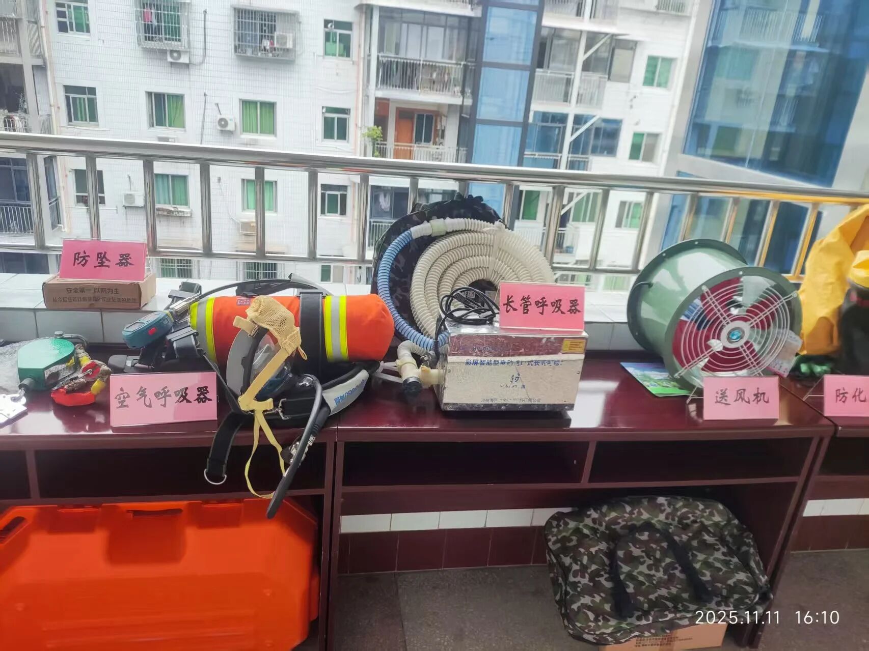 会场外,对防坠器、气体检测仪、轴流风机、正压式空气呼吸器、长管呼吸器等有限空间作业需要的安全防护装备和应急救援装备进行了集中展示。