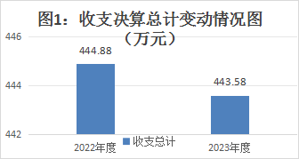 2023年度收、支总计均为443.58万元。与2022年度相比,收、支总计各减少1.3万元,下降0.2%。主要变动原因教职工减少。