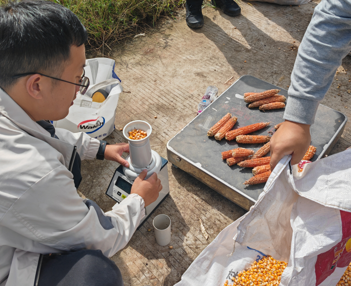 验收过程中,专家组严格按照农业农村部粮油高产创建测产验收方法,在示范片中选择3块代表性地块进行挖方测产,每个地块面积不少于67㎡。现场实收全部果穗,并采用平均穗重法选取20穗作为折算样本,使用PM-8188谷物水份仪测定籽粒含水量,统一折算为标准含水量(14%)下的产量。经测算,三块地块中最高亩产达433.2公斤,平均亩产为417.2公斤。