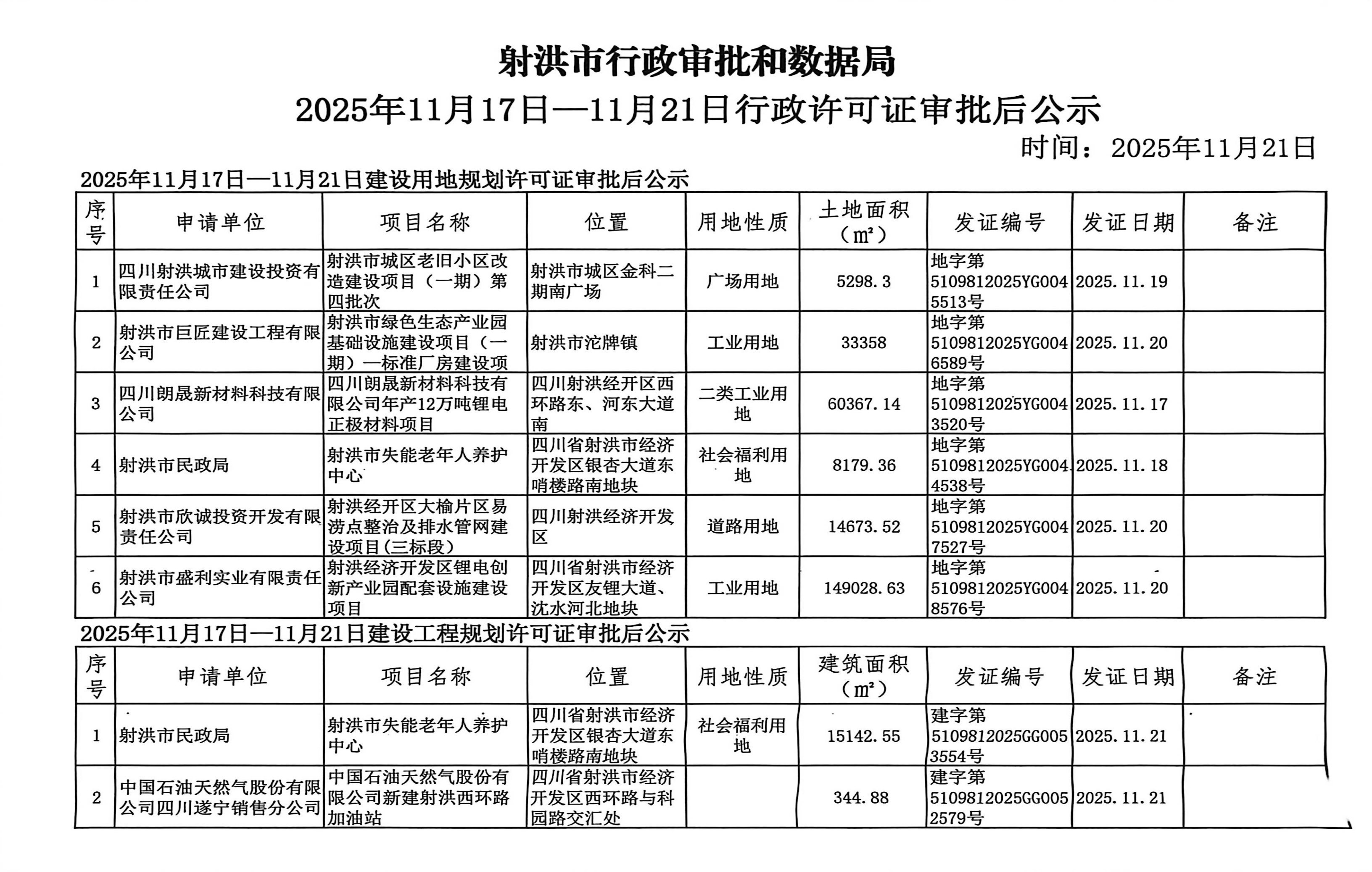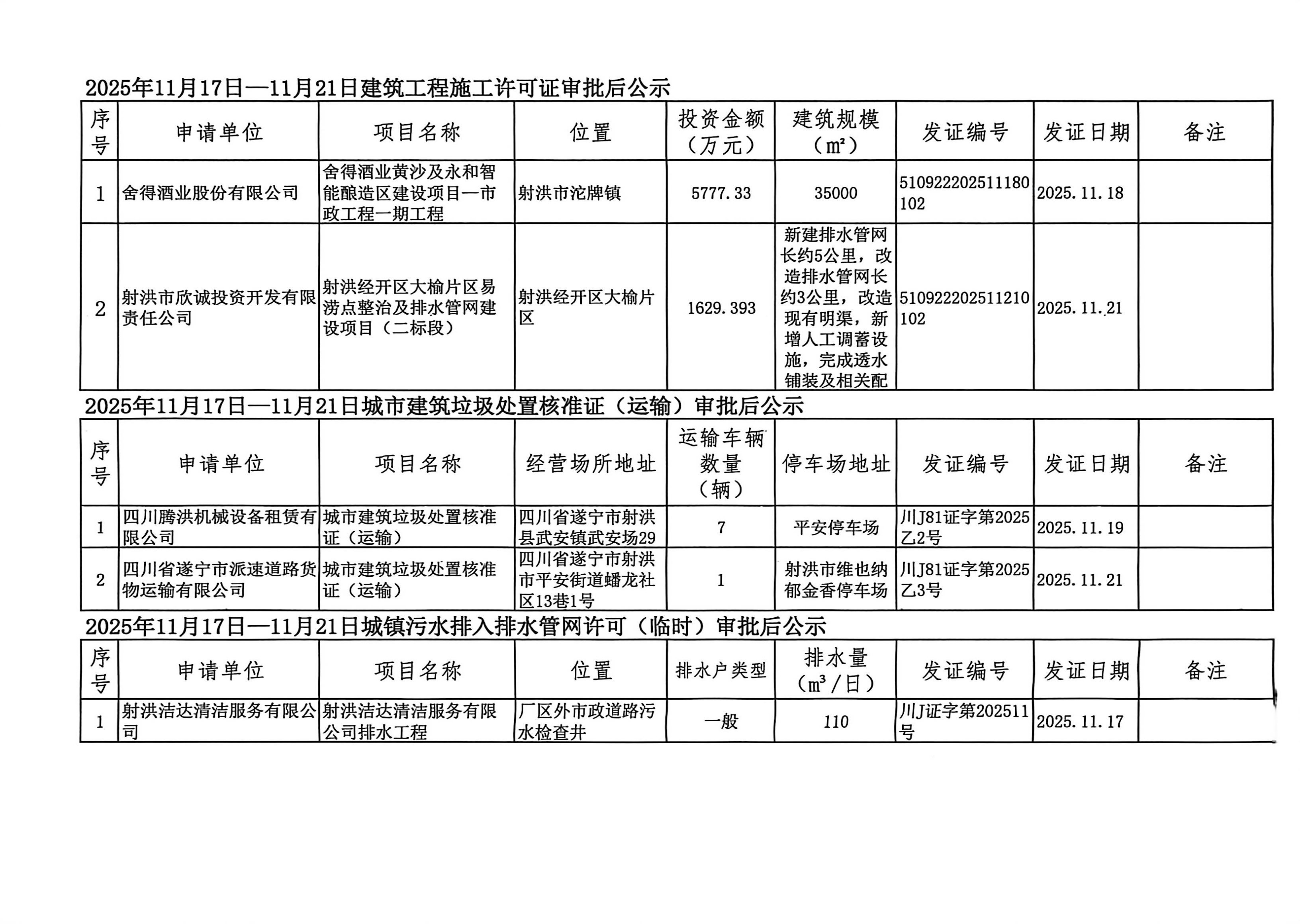 射洪市行政审批和数据局关于2025年11月17-11月21日行政许可证后公示
