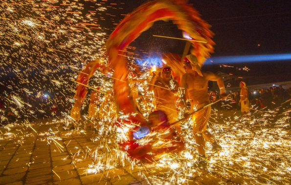 除青堤菜刀外,当地民俗文化中最引人注目的,莫过于青堤的铁水火花龙。据清光绪年间《射洪县志》记载:“(正月)十五日为元宵节,是夜观灯,阖咸燃巨烛如白昼。民间以龙灯、狮子舞剧遍游街市。观者以铁末合火药贮竹筒中,喷烧之共焰,冲出现花形无数,谓之‘放花’。”书中所记的“放花”,正是青堤铁水火花龙早期的表演形态,俗称“打铁花”。