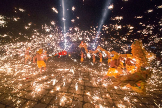 打铁花前,往往需进行三个步骤。一是耍龙。当夜色来临,净身后的耍龙者需提前拜庙点睛、下山游龙。以火流星开道,牌方灯跟进,火龙口吐火焰,通体有草鞋板、油蚱蜢作照明,后有唢呐、锣鼓等垫后。游龙过程中,遇见药铺子要三叩头再进屋上香,而后“头进尾出”,以表示对医者的谢意、敬意。耍龙时,舞龙者只身着火把裤,足穿草鞋,舞着火龙呼啸而来,在钢花四溅中上下飞舞。