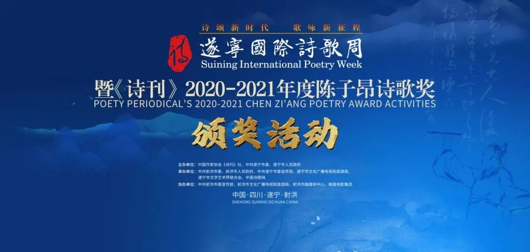 2022遂宁国际诗歌周暨《诗刊》2020—2021年度陈子昂诗歌奖颁奖活动将于2022年11月3日至5日在四川射洪举办。《诗刊》社陈子昂年度奖共常设年度诗人奖、年度青年诗人奖、年度诗词奖、年度青年诗词奖、年度理论家奖、年度青年理论家奖、年度国际诗坛诗人奖、年度翻译家奖等8个奖项。本次颁奖活动还特设了“百年路新征程”诗歌创作工程特別奖。
